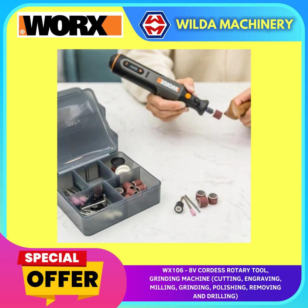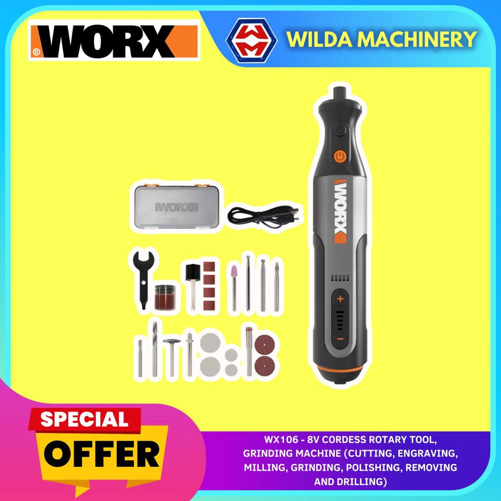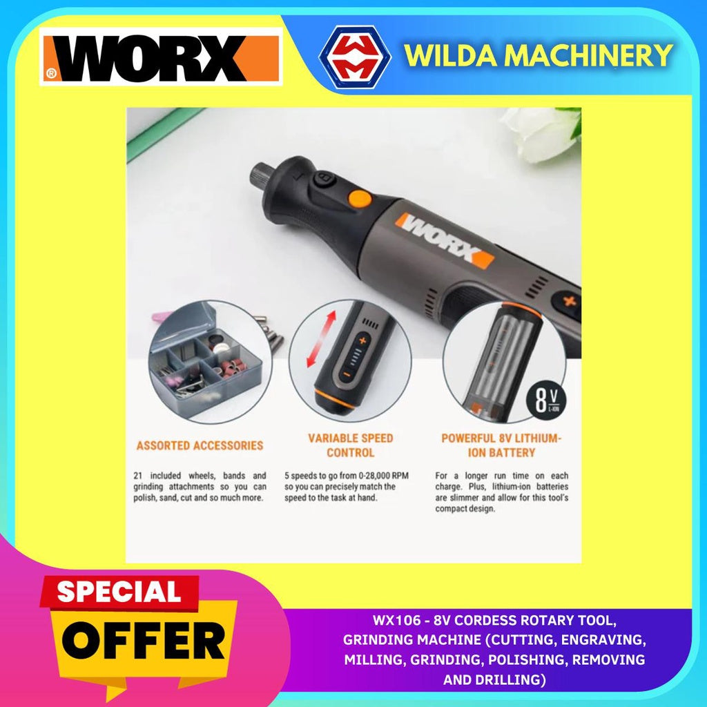 The Worx WX106 8V Rotary Tool featuring powerful lithium-ion battery for longer run time in a lightweight, compact design allowing you to overcome various working task such as cutting, engraving, milling, grinding, polishing, removing and drilling.