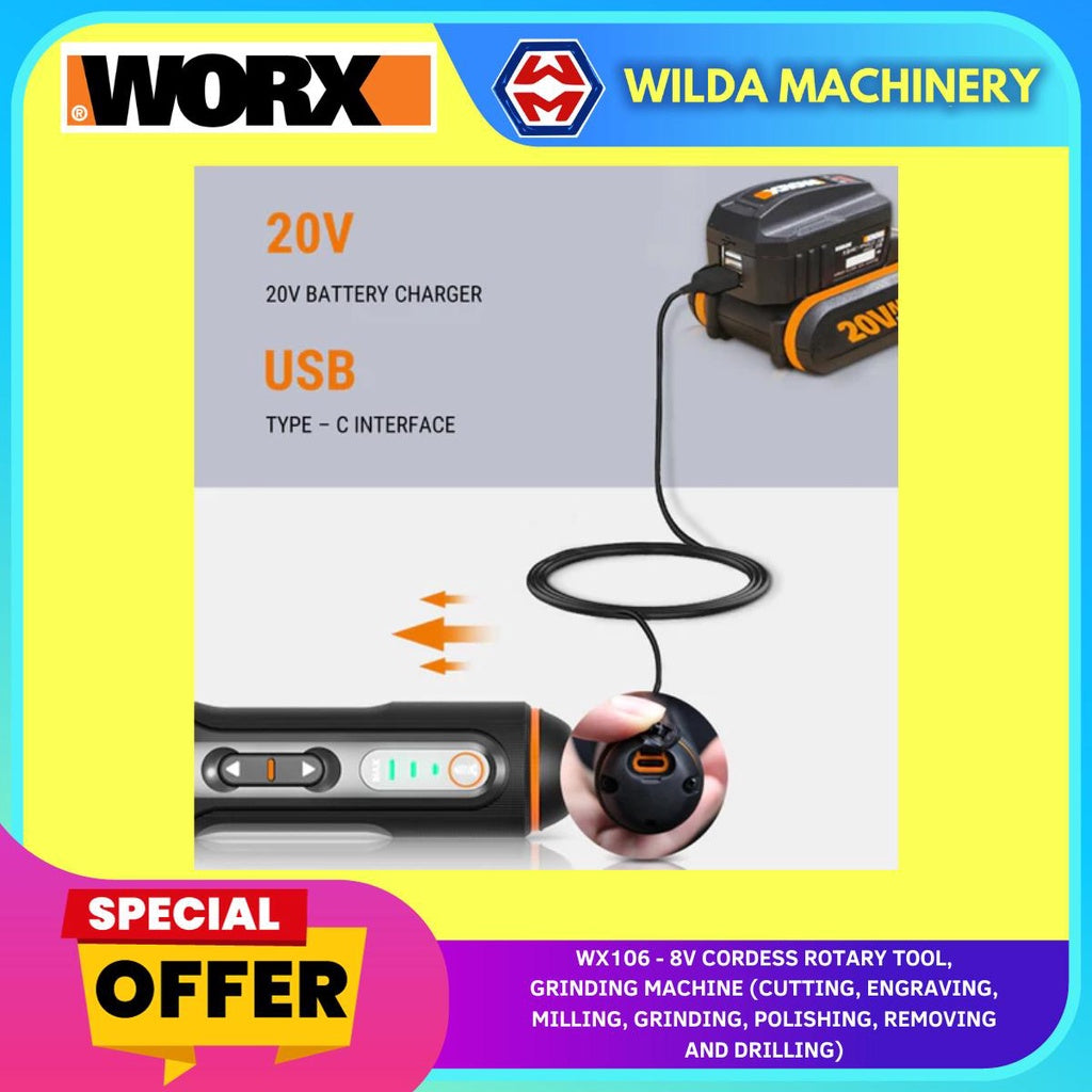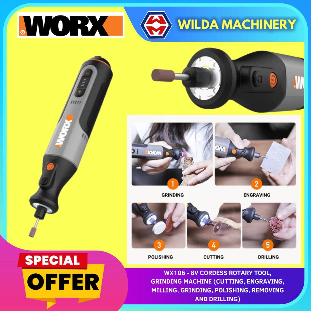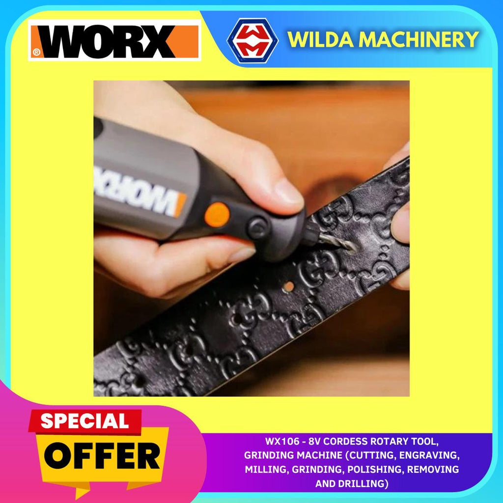 The Worx WX106 8V Rotary Tool featuring powerful lithium-ion battery for longer run time in a lightweight, compact design allowing you to overcome various working task such as cutting, engraving, milling, grinding, polishing, removing and drilling.